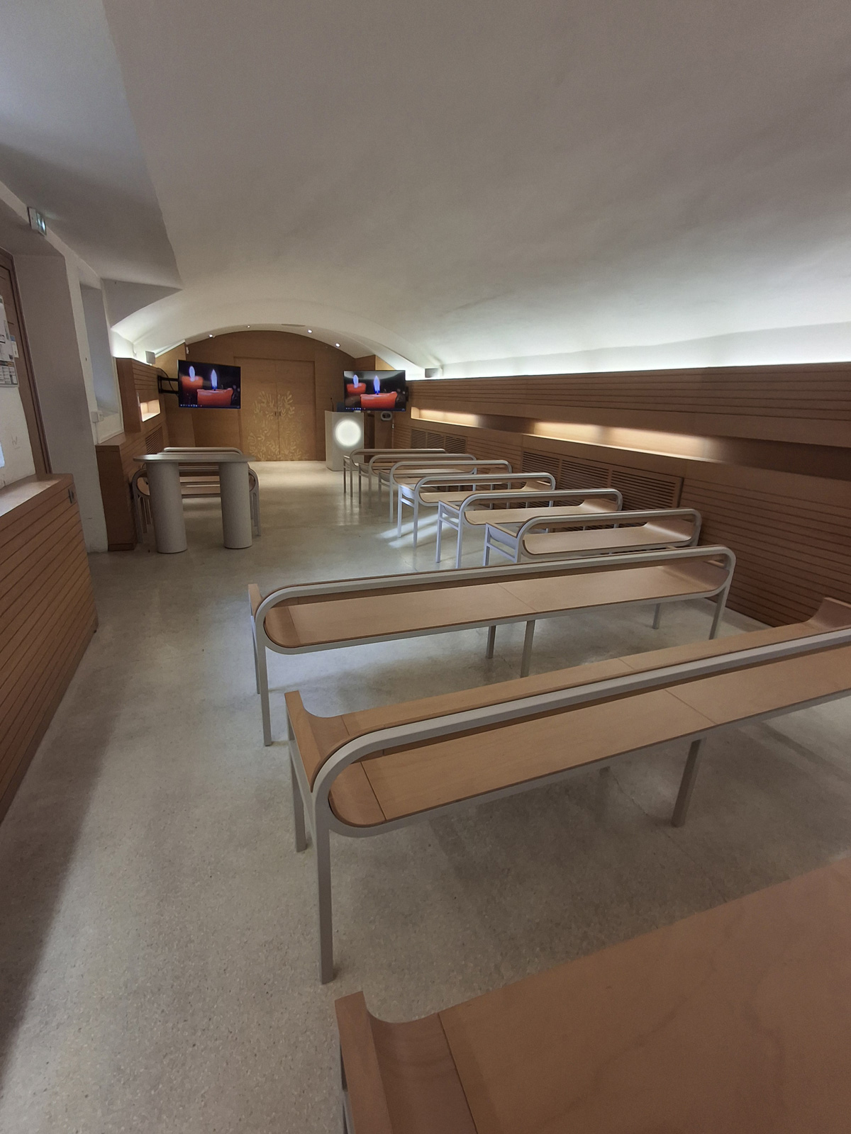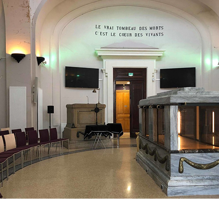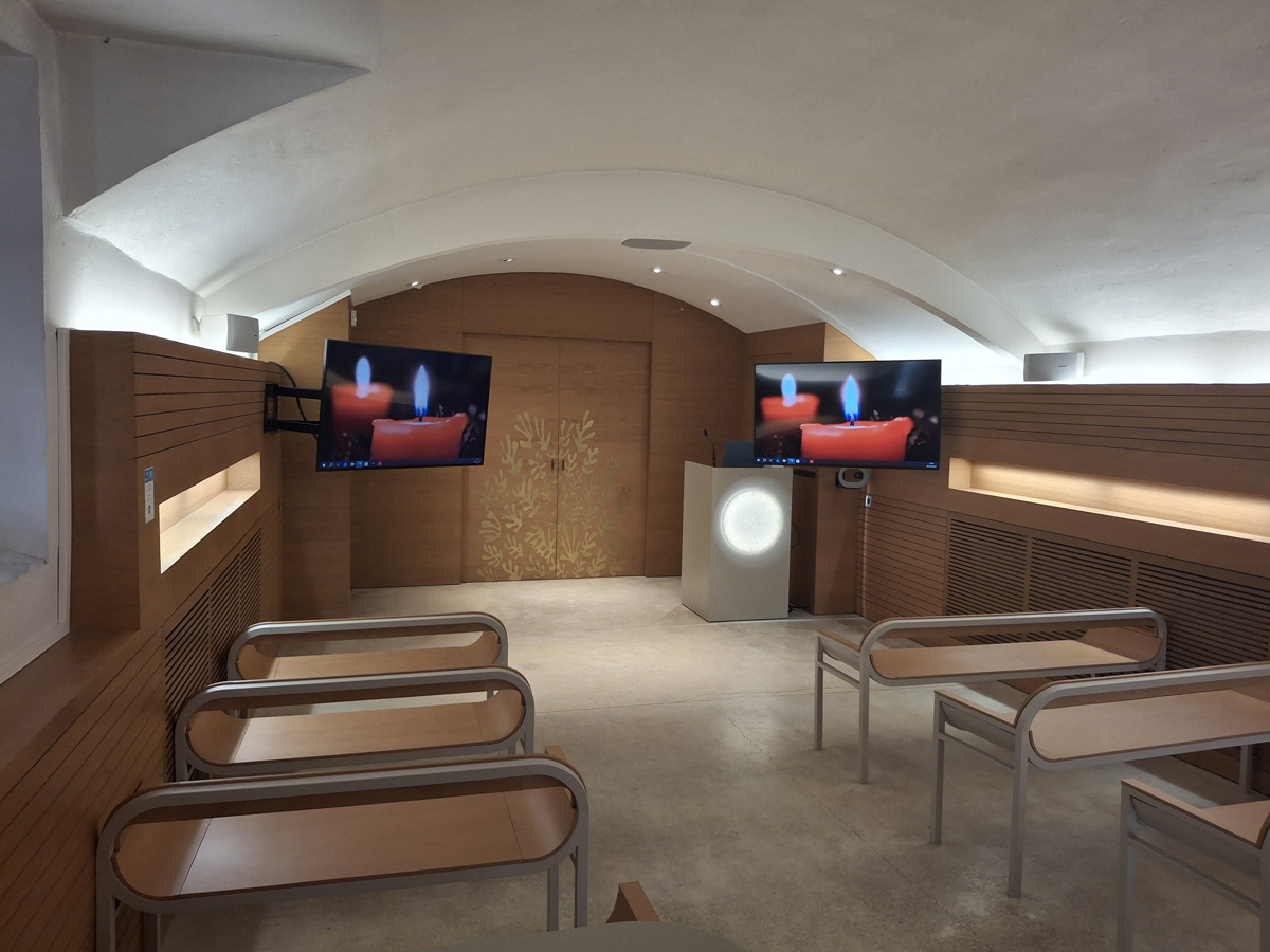 Dans le cadre des cérémonies d’hommage organisées au sein du crématorium, les salles de cérémonie sont équipées d’un dispositif de diffusion audio et vidéo permettant d’accompagner, avec sobriété et dignité, le temps du recueillement.